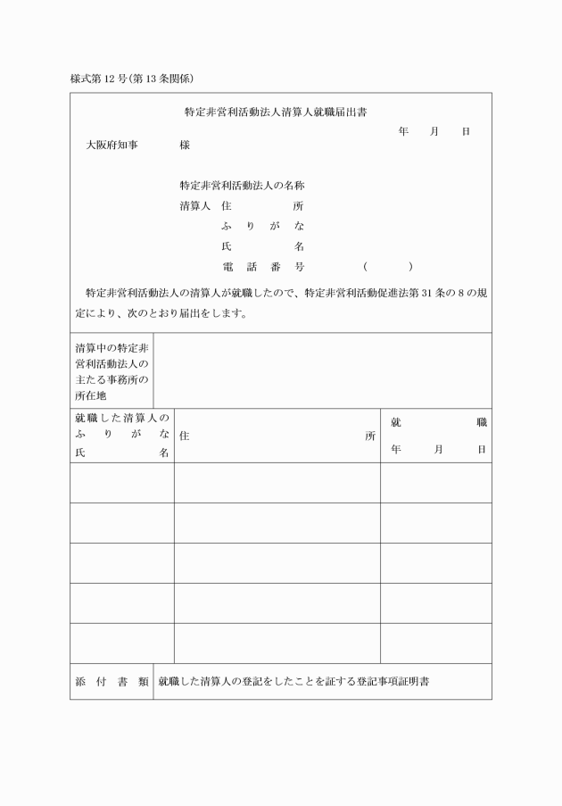 第十三条 法第三十一条の八の規定による届出は、当該届出に係る清算人の登記をしたことを証する登記事項証明書を添付した特定非営利活動法人清算人就職届出書(様式第十二号)を提出することにより行わなければならない。