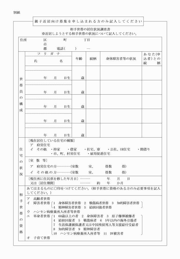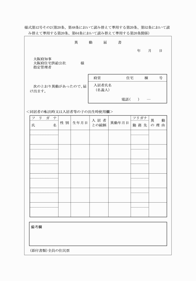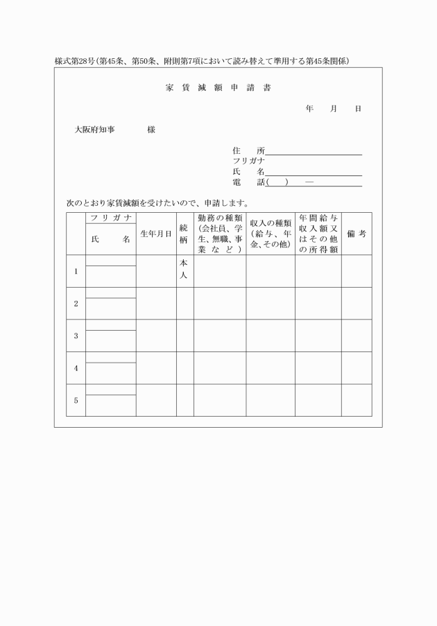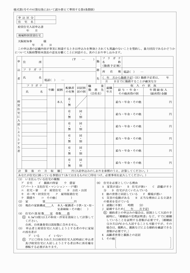 5 第一項の府営住宅入居申込書には、次に掲げる書類を添付しなければならない。ただし、知事が必要と認めたときは、当該府営住宅入居申込書の提出後にこれらの書類を提出することができる。