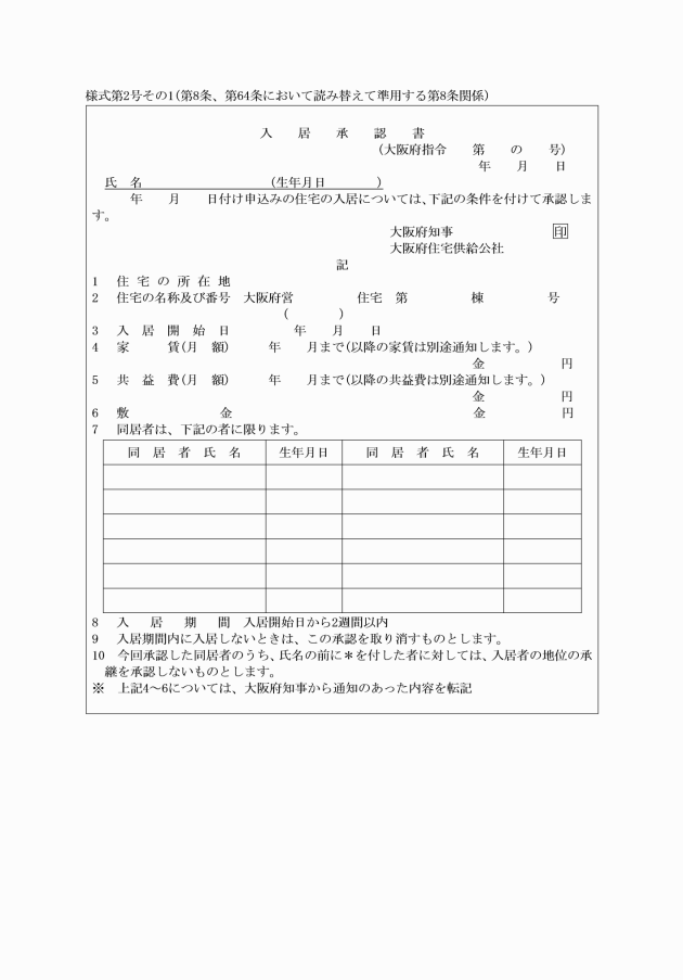 2 知事は、前項の申請があった場合において、当該申請に係る者が次に掲げる条件のいずれにも該当し、かつ、公営住宅の管理上支障がないと認めるときは、これを承認する。