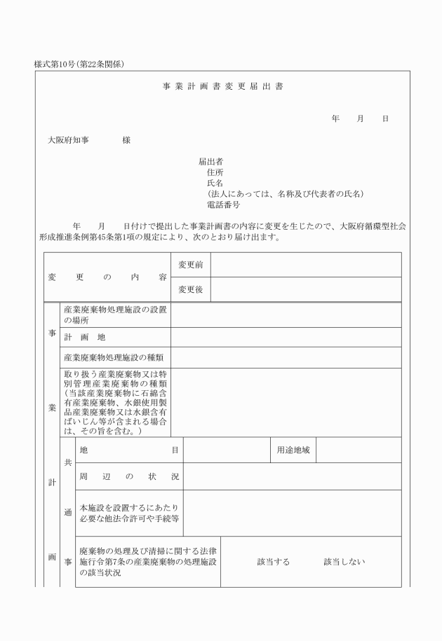 第二十二条 条例第四十五条第一項の規定による届出は、次に掲げる事項を記載した事業計画書変更届出書(様式第十号)を提出することにより行わなければならない。