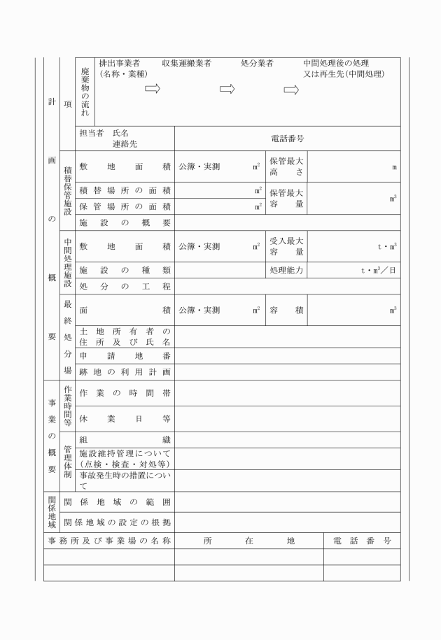 一 当該事業計画書に係る産業廃棄物処理施設(以下「計画施設」という。)(第一項第二号に掲げる施設にあっては、産業廃棄物の保管の場所を含む。)の構造及び当該計画施設に付随する設備の構造を明らかにする平面図、立面図、断面図、構造図及び設計計算書並びに最終処分場の場合にあっては、周辺の地形、地質及び地下水の状況を明らかにする書類及び図面