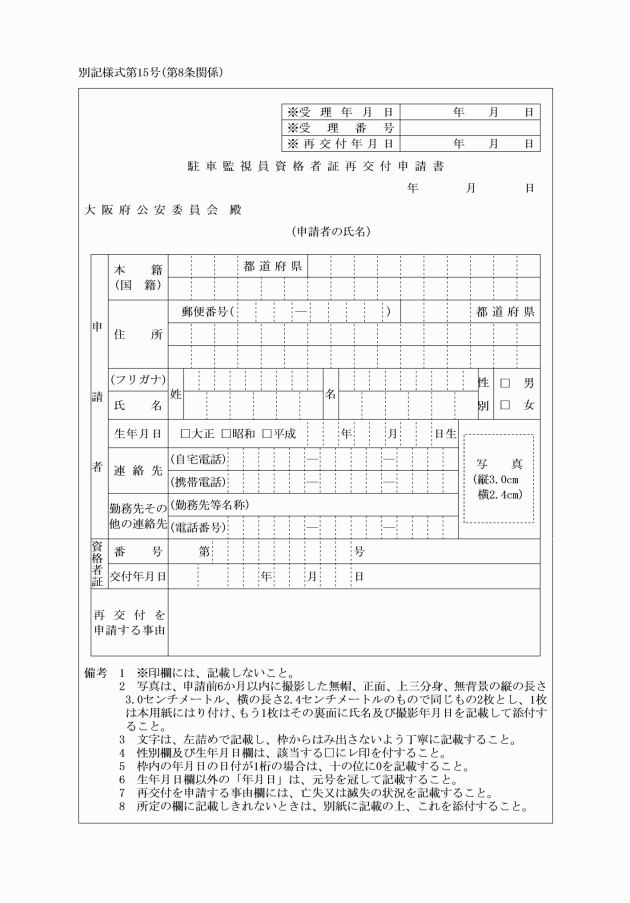 第4条 規則第9条第2項に規定する再交付申請書は、駐車監視員資格者講習修了証明書再交付申請書(別記様式第6号)とする。