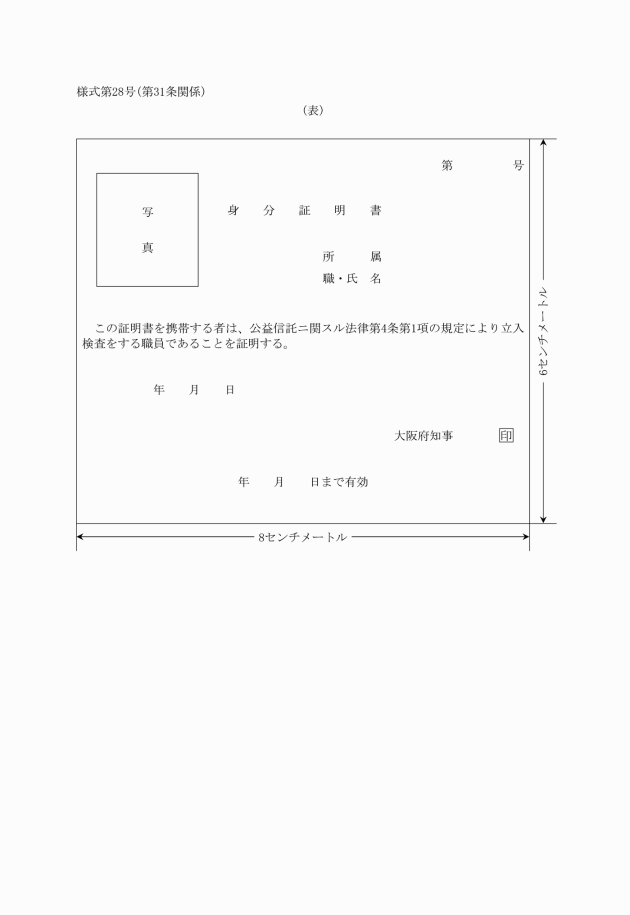 第三十一条 法第四条第一項の規定により立入検査をする職員は、身分証明書(様式第二十八号)を携帯し、関係者に提示しなければならない。