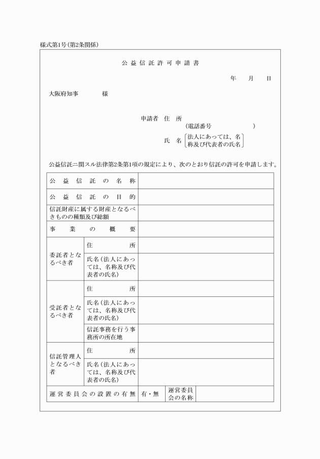 第二条 法第二条第一項の許可を受けようとする者は、公益信託許可申請書(様式第一号)を知事に提出しなければならない。