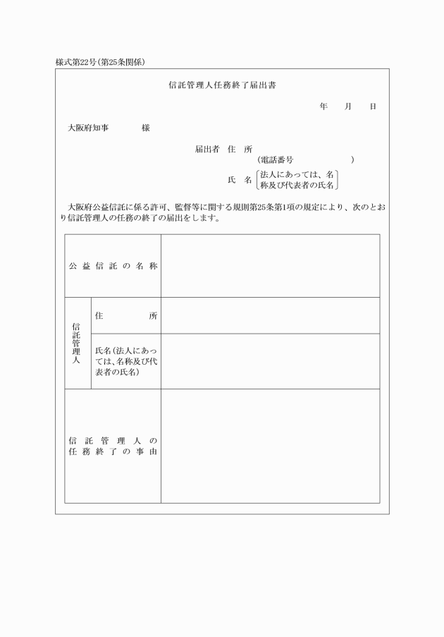 第二十九条 受託者は、信託が終了したときは、遅滞なく、公益信託終了届出書(様式第二十六号)を知事に提出しなければならない。