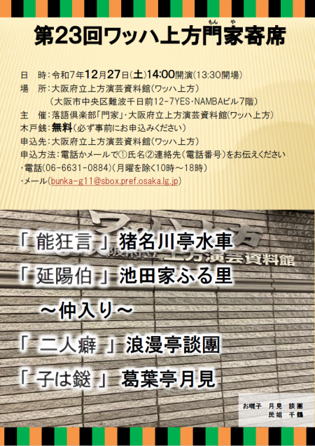【参加受付中】「第23回ワッハ上方門家寄席」開催のお知らせ(令和7年12月27日(土曜日))