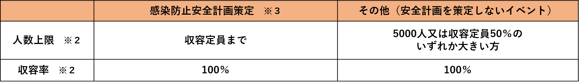 ※2 収容率と人数上限でどちらか小さい方を限度(両方の条件を満たす必要)。収容定員が設定されていない場合は、人と人とが触れ合わない程度の間隔を確保すること