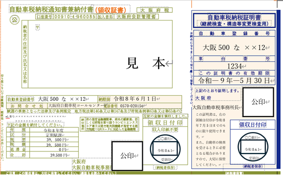 自動車の継続検査及び構造等変更検査を受ける場合に使用する納税証明書は、「自動車税納税通知書兼納付書(領収証書)」等と一連の書類となっており、納税証明書欄に金融機関等の領収日付印の押印のあるものが使用できます。