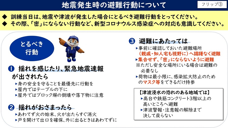 - 訓練当日は、地震や津波が発生した場合にとるべき避難行動をとってください。