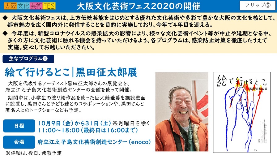 会見項目「大阪文化芸術フェス2020プログラム『絵でいけるとこ|黒田征太郎展』、『歌舞伎特別公演』、『大阪文化芸術フェスpresents OSAKA GENKI PARK』の実施について」で使用した資料