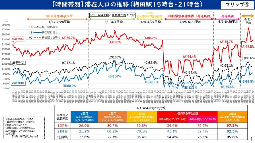 - 梅田駅における15時台、21時台の滞在人口の推移を表示している。