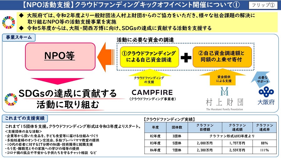- 大阪府では、令和2年度より一般財団法人村上財団からの協力をいただき、様々な社会課題の解決に取り組むNPO等の活動支援事業を実施。