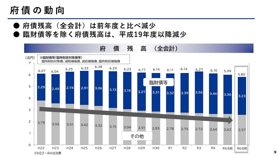 - 臨時財政対策債の発行額の減少により、府債の残高は5.8兆円程度となる見込みで、前年度と比べて減少しています。