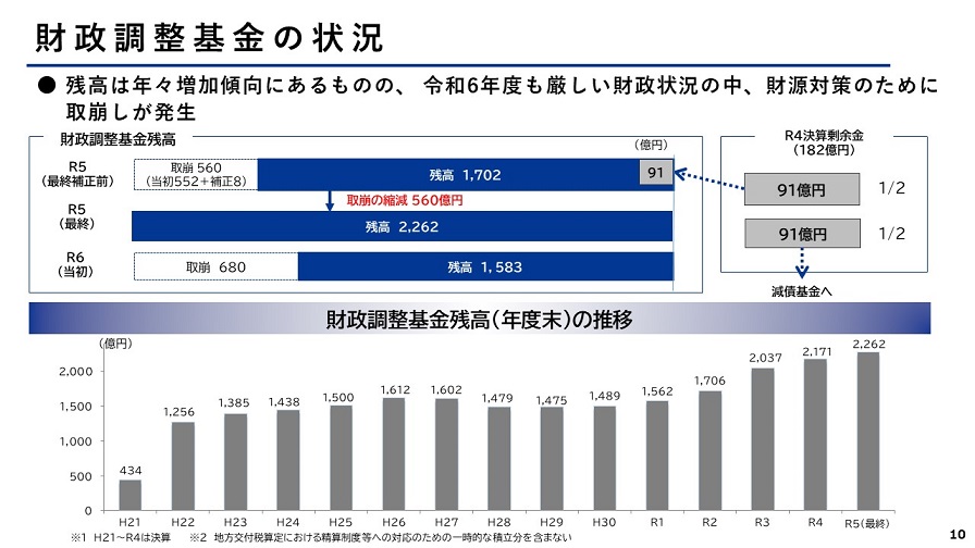 - 一方、令和6年度当初においては、財源不足により680億円を取り崩す必要があり、残高は1,583億円となる見込みです。