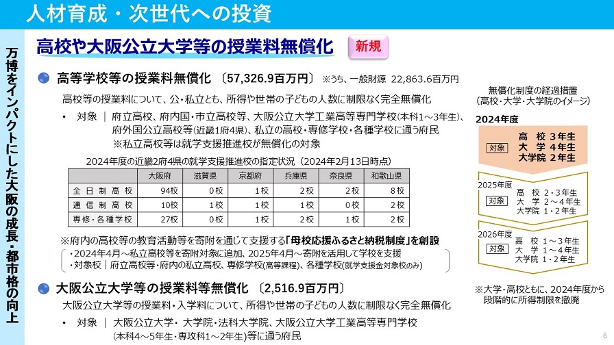 - この無償化制度については、2024年度から3年かけて段階的に所得制限を撤廃します。まず、今年4月からは、高校3年生、大学4年生、大学院2年生を対象に所得制限を撤廃し、2年目から対象を段階的に広げ、2026年度には全ての学年が対象となり、大阪における授業料の完全無償化が実現します。