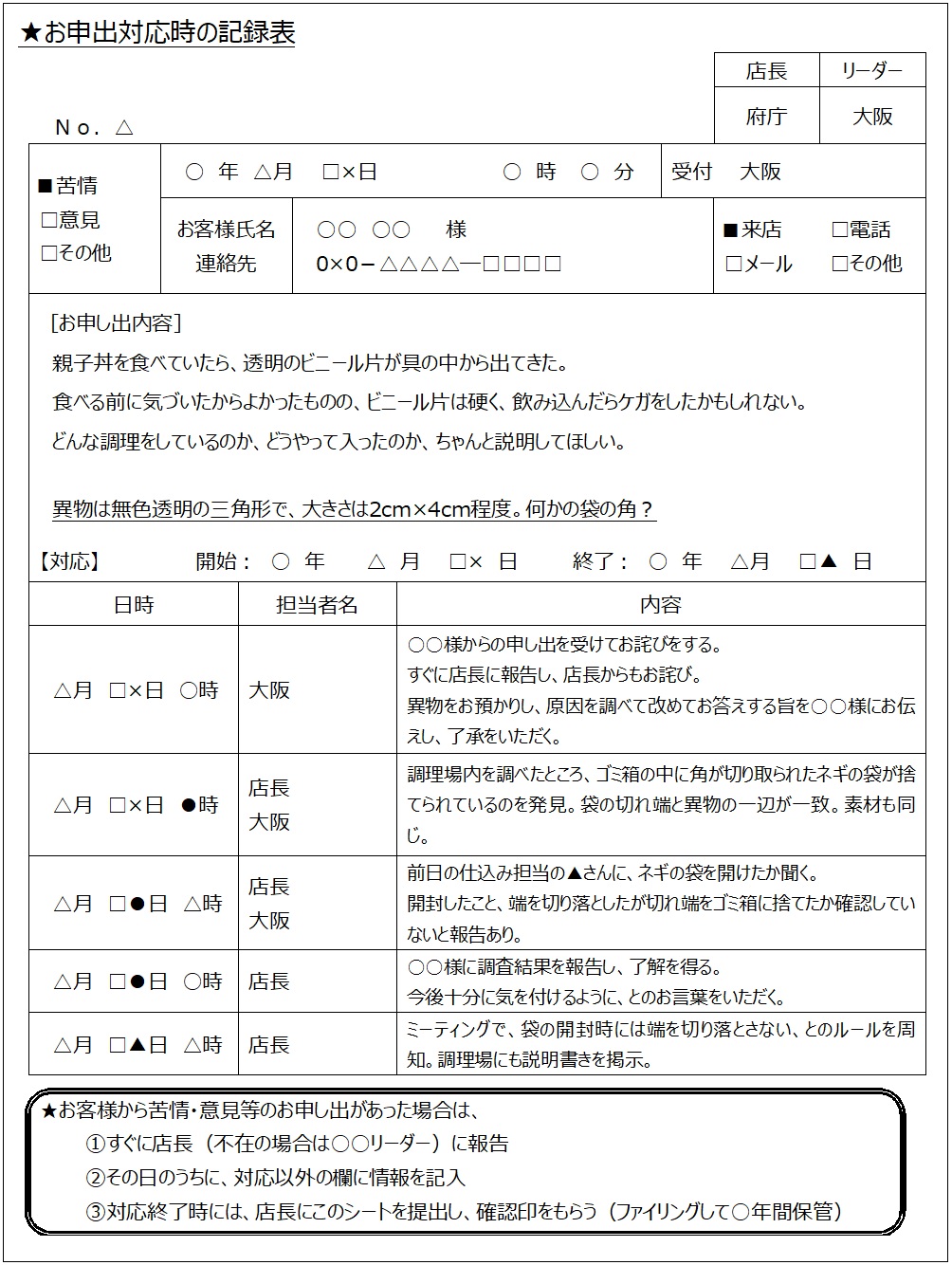お客様からの相談や届出、食品の事故への対応を速やかに行うことができるよう、対応方法をルール化しておきましょう。