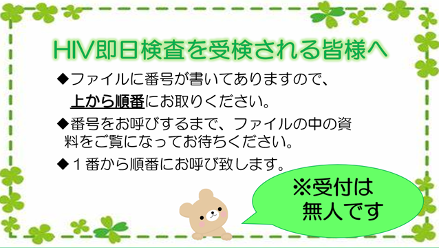 検査結果:当日の午前中、検査を受けた検査場にて、ご本人に直接お知らせします。
