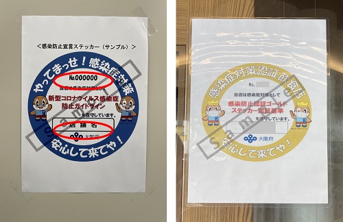 - 感染拡大予防ガイドラインを遵守しているとともに、申請する店舗において大阪府が発行する「感染防止宣言ステッカー(ブルーステッカー)」又は「感染防止認証ゴールドステッカー(ワクチン・検査パッケージ制度登録店用ゴールドステッカーを含む)」を掲示していること。