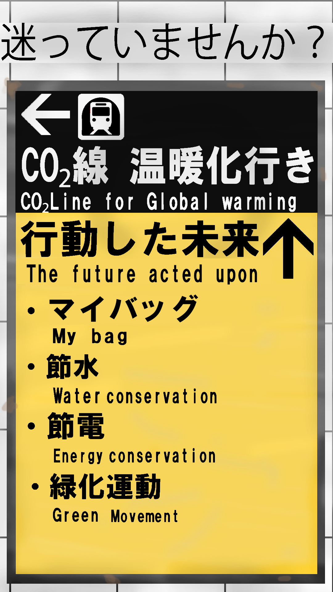 未来への案内表示 | 津林 晶 さん | 1人の行動でも未来は変えることができる。しかし、行動しなければ変わらない。そのことを案内表示で表現しました。未来への行き先を決めるのは、あなたの行動です。 |