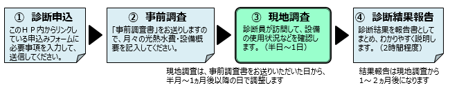 ※診断の際には、設備の使用実態などについてご質問をいたしますので、設備の管理責任者などの立会いをお願いします。