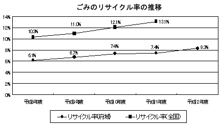 一般廃棄物の排出量も、年々減少傾向にありますが、1人1日あたりの排出量は1.3kgで、全国の1.1kgに比べると多く、また、リサイクル率は上昇傾向(大阪府8.3%)にありますが、これも全国(13.1%)に比べるとまだまだ低いのが現状です。