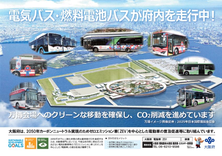 大阪府では、2050年カーボンニュートラル実現のために様々な取組を推進しており、その取組の一つとして、SDGsを掲げる2025年大阪・関西万博の会場へのクリーンな移動手段を確保し、同博覧会を契機にバスのゼロエミッション化を促進することを目的に、駅シャトルバス等へのEVバス、FCバスの導入を進めてきました。