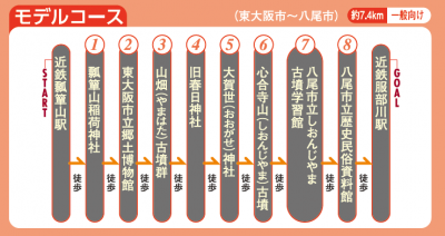 瓢箪山駅から服部川駅の間の生駒山麓に点在する神社、史跡を巡るコース。スタート地点付近の瓢箪山稲荷神社は日本三稲荷のひとつ。東大阪市立郷土博物館では東大阪市の歴史をわかりやすく紹介している。隣接する山畑古墳群のひとつは石室の内部が見学できて興味深い。八尾市の心合寺山古墳は、史跡公園として整備されており、休憩地点としても適している。その後、歴史情緒ある町並みを抜けると地元の歴史と民俗を紹介する八尾市立歴史民俗資料館に到着する。高低差も少なく、年配の人や子ども連れも歩きやすい。