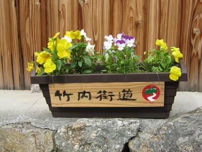 竹内街道・花回廊プランター正面に飾っています「竹内街道」木製プレートは、富田林少年サポートセンターや富田林市立金剛中学校の職場体験学習に参加した生徒により製作されました。