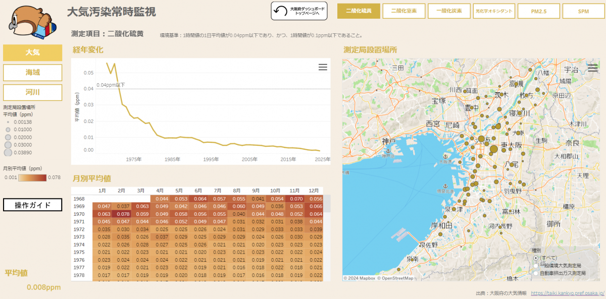 大阪府では、1968年から大気常時監視、1972年から公共用水域の環境測定を継続的に実施しており、これまでに蓄積した膨大なデータを一目でわかるようにグラフやマップでみることができます。