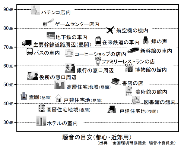騒音の問題では、音の大きさの単位として「デシベル」を用いています。デシベルというだけではうるささが実感しにくいと思いますので、具体的な例をお示します。