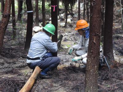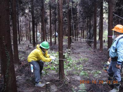 安全に間伐ができるように、まずは昨年度間伐した木を、
