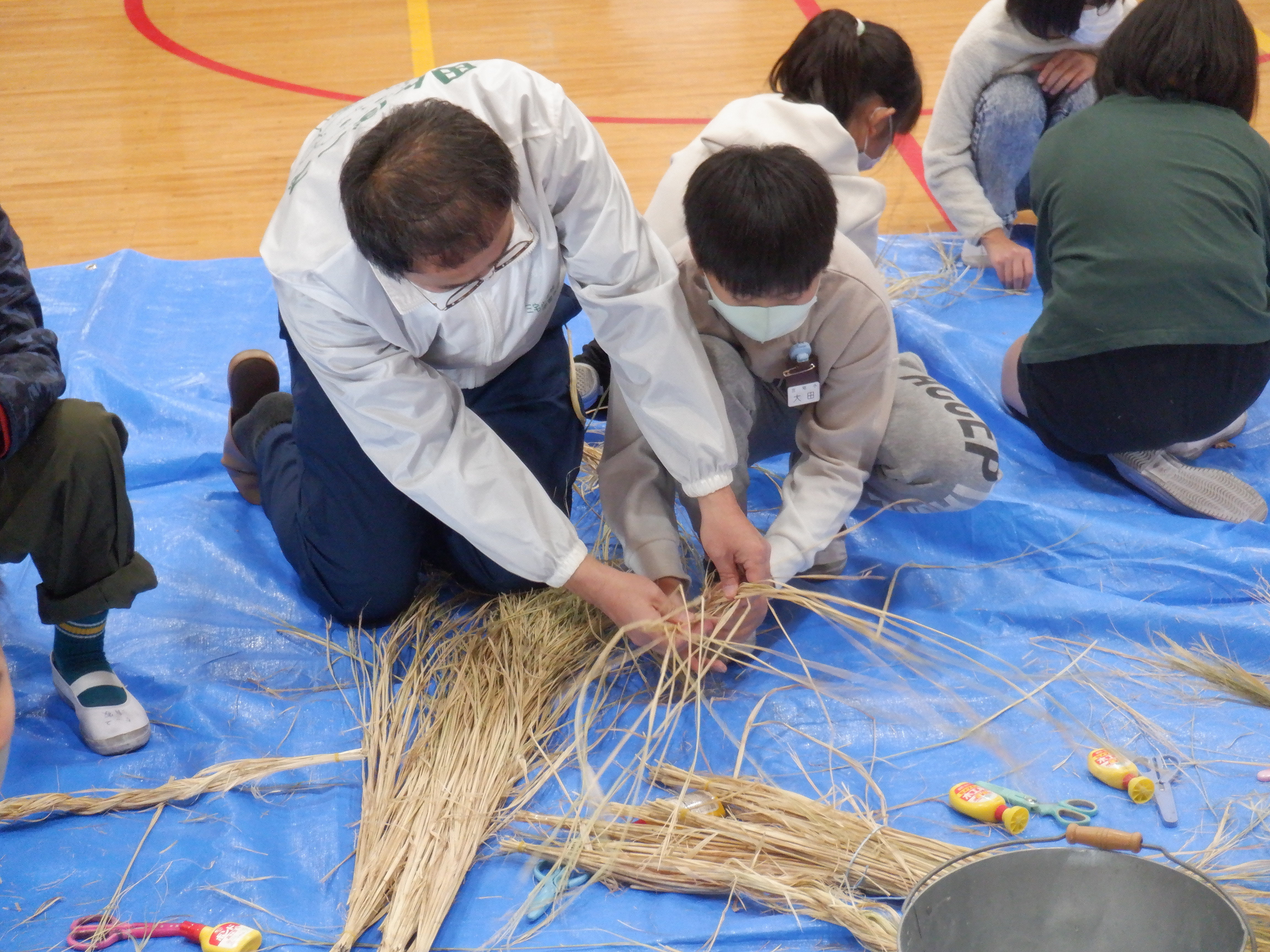 5年生が稲わらを使ってリースを作りました。この半年間みんなで米作りを頑張った集大成です。