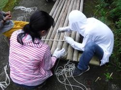 10時頃から大阪芸術大学生10名と棚田保存会の方々3名が現地に集まって活動をスタートしました。棚田保存会から提供いただいた稲架木(はざぎ。収穫した稲を乾燥させるために、かけておくための木)を十数本つなぎ合わせて板状にします。試行錯誤しながら、稲架木同士をロープ・板で固定していきます(写真1、写真2参照)。続いて、板に登っていくための大小様々な足掛け用木材を、固定していきます。子どもたちが遊んでくれる所を想像しつつ、子どもたちの歩幅に合わせて木材を配置します。徐々に作業に慣れてチームワークが良くなってきたところで、しばし手を休めて一旦お昼休憩となりました。午後からの作業に向けて英気を養います!