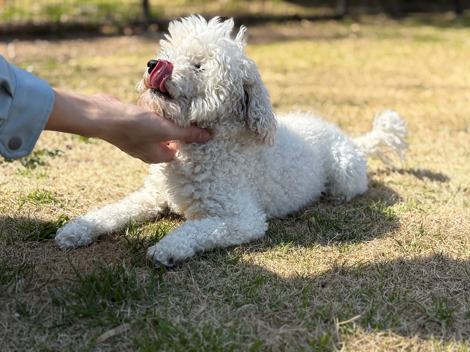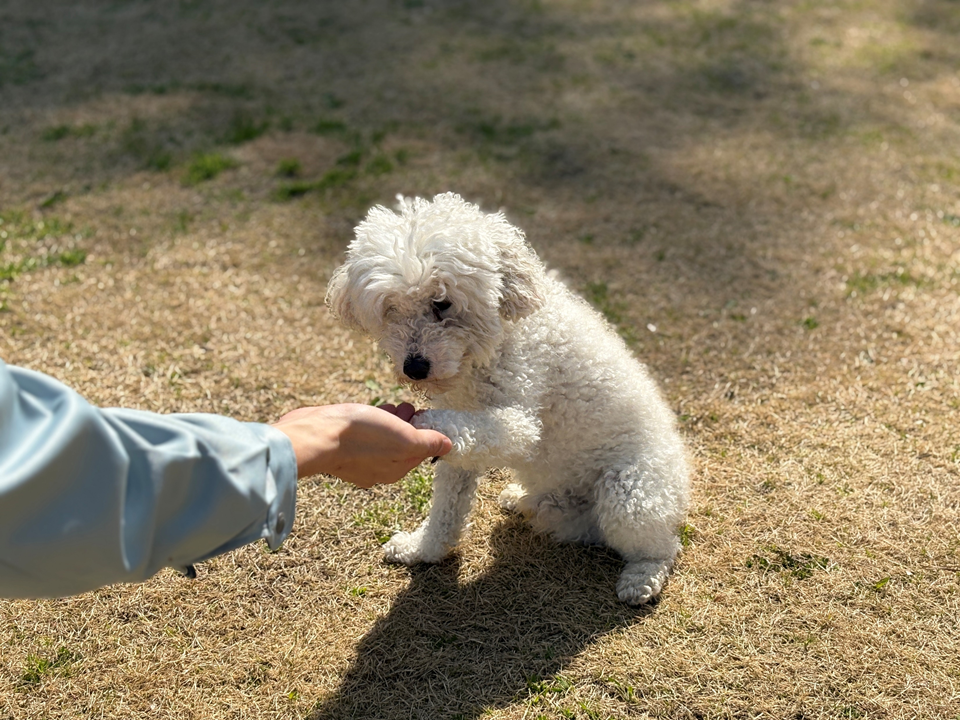 くるくるのカールした白い毛が可愛い男の子。「おすわり」「おて」「ふせ」「ちょうだい、ちょうだい」など何でもできる優等生です!その代わりに「ご褒美は約束ね!」と言わんばかりにこちらを見つめてきます。おとなしい子ですが、とても寂しがり屋で離れたくない時に鼻を鳴らしたり、抱っこを求めてきます。こんな甘えたなこの子と、たくさんふれあっていただける飼い主さんを募集中です! |