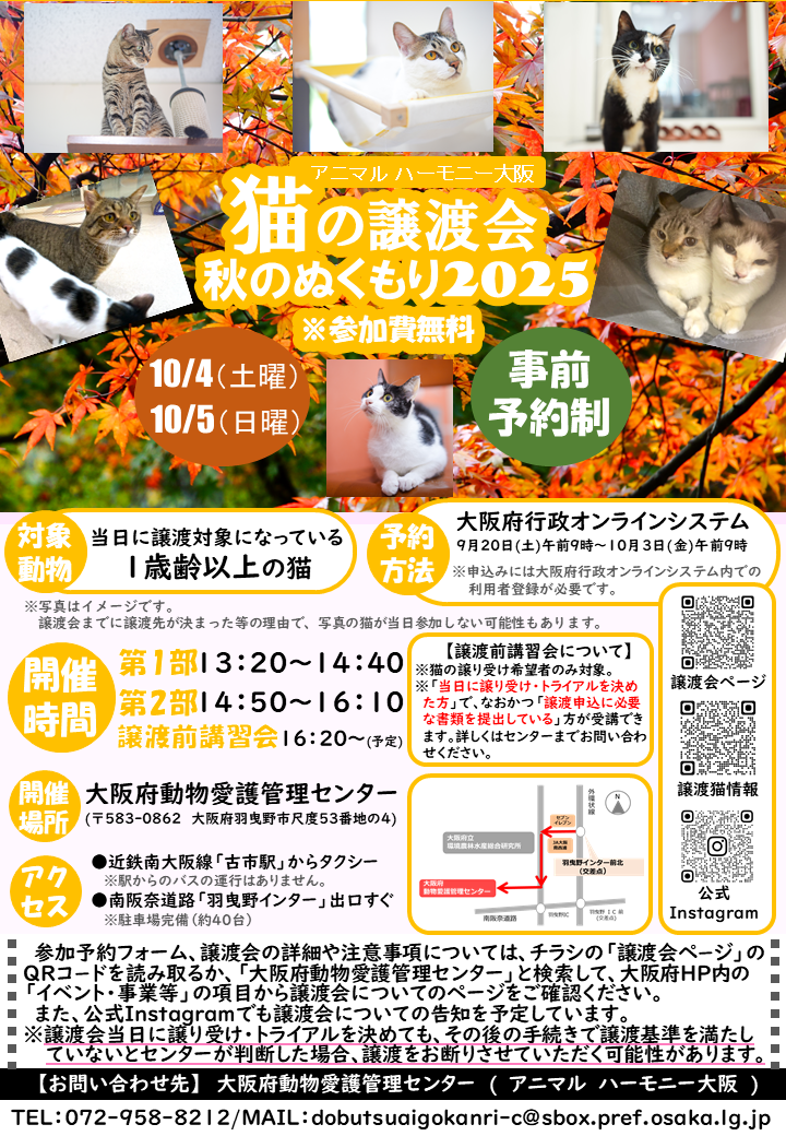 当センターには新しい飼い主さんを待っている動物たちがいます。そのような動物たちの新しい出会いの場となるように、10月4日㈯5日㈰に「1歳以上の猫」を対象として、実際に見てふれあっていただける「猫の譲渡会 秋のぬくもり2025」を開催いたしました。
