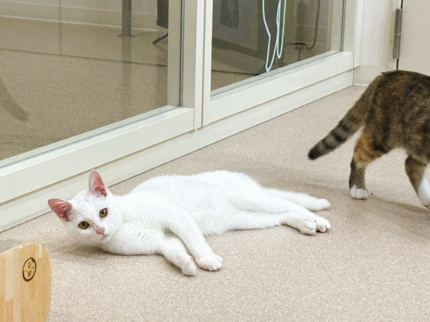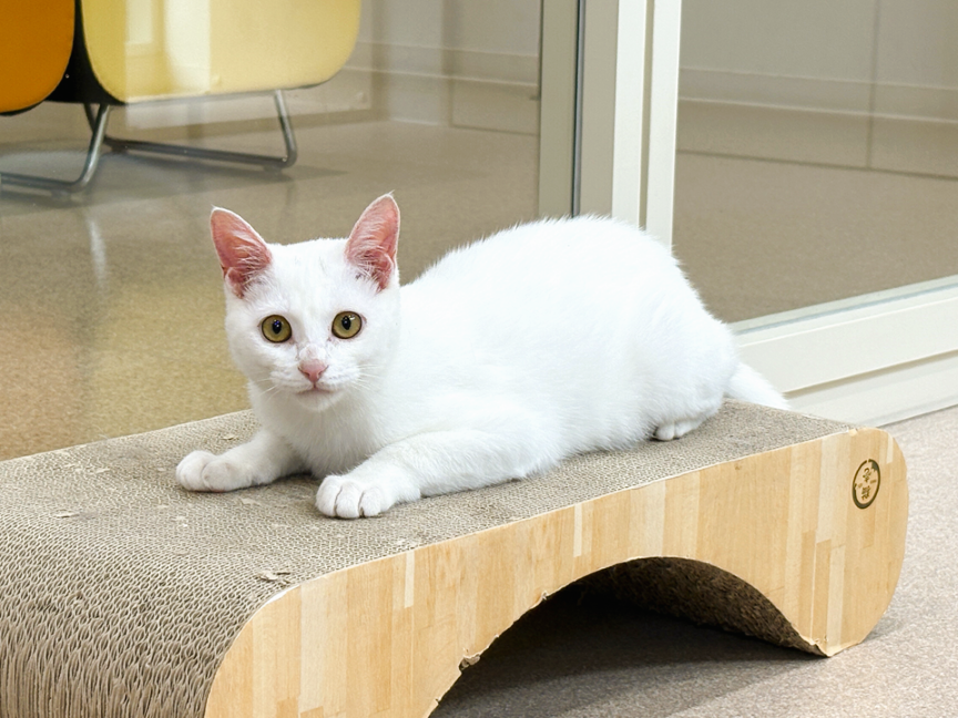 怖がりな、白が多めでお顔とおしり周りが三毛猫の女の子です。丸くなって過ごすことが多く、当初は手を近づけただけで逃げていましたが、最近は怖がりながらも触らせてくれるようになりました。毎日少しずつふれあいながら、仲良くなる経過を楽しんでくださる方にピッタリの猫ちゃんです! |