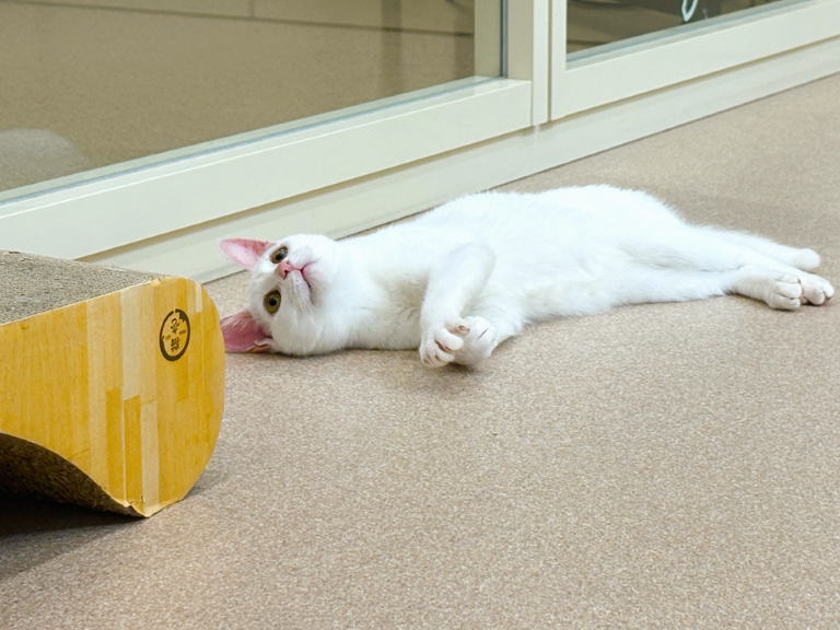 受け身型甘えん坊さん。自分から近づかず、じっと見つめていて、むしろ怒っている?と思ってしまいますが、違います! ゆっくり手を近づけ、おしりをなでてあげてください。あれよあれよと、おしげもなくお腹を見せて「なでるよね?」と語りかけます。少し左右に揺らしながらなでると、グルグルが止まらない!!そしてこの子の魅力は静止画ではおさめられない! ひかえめな甘えん坊男子に魅了されてください。 |