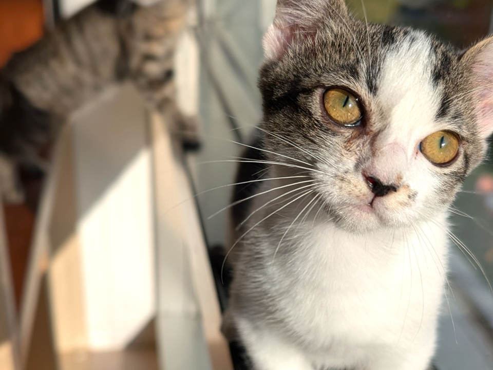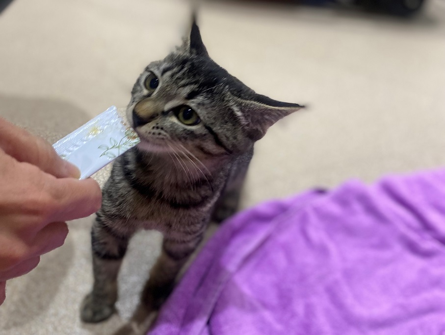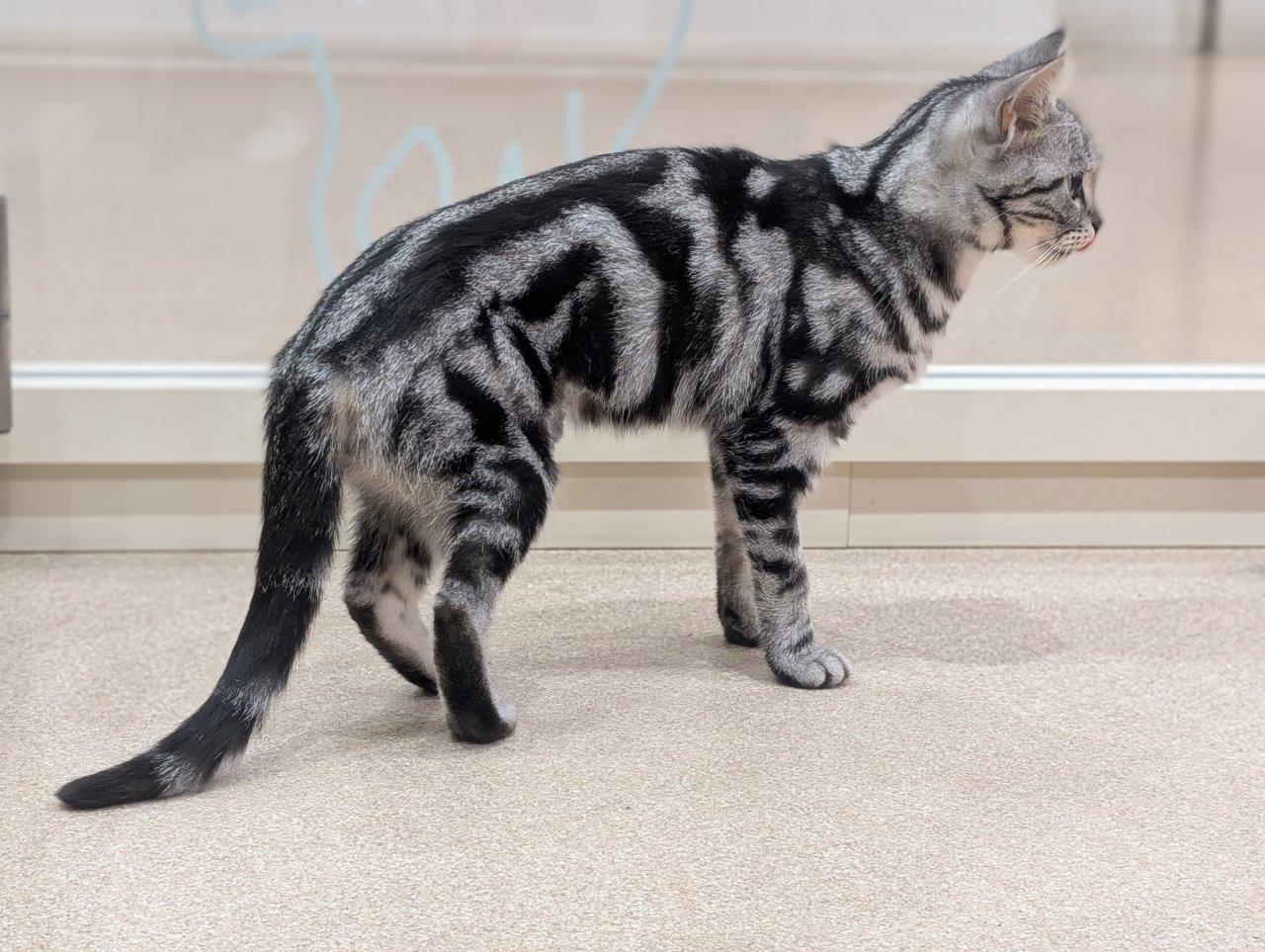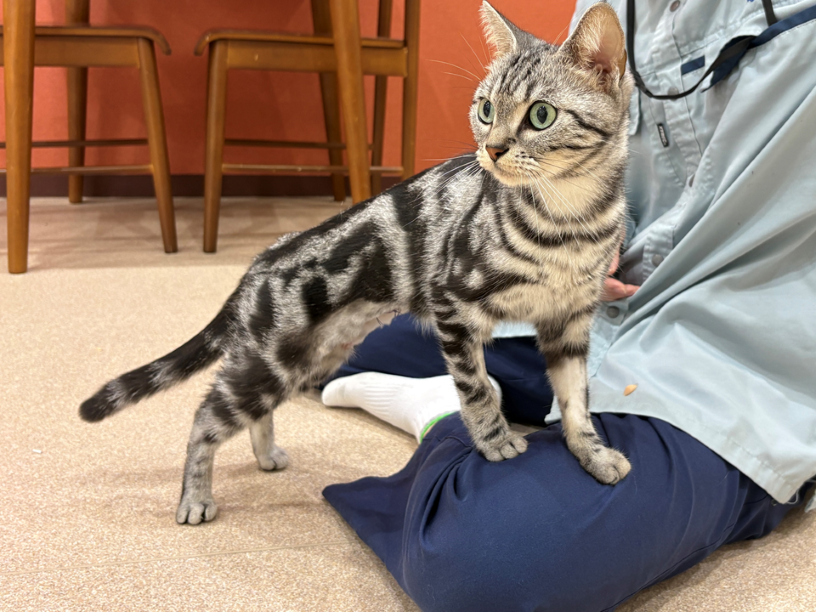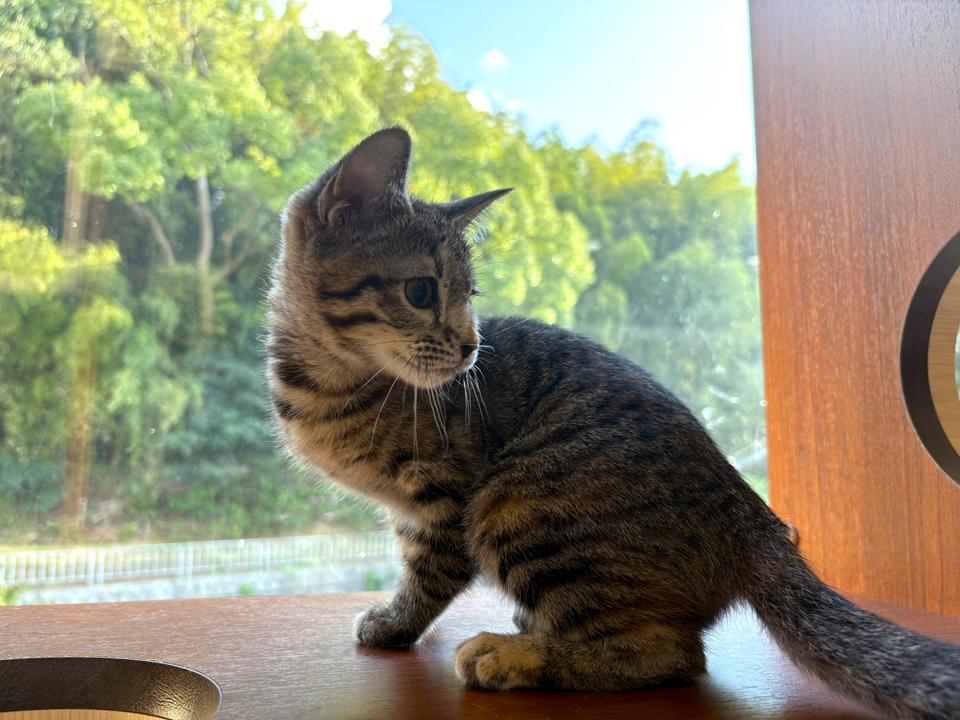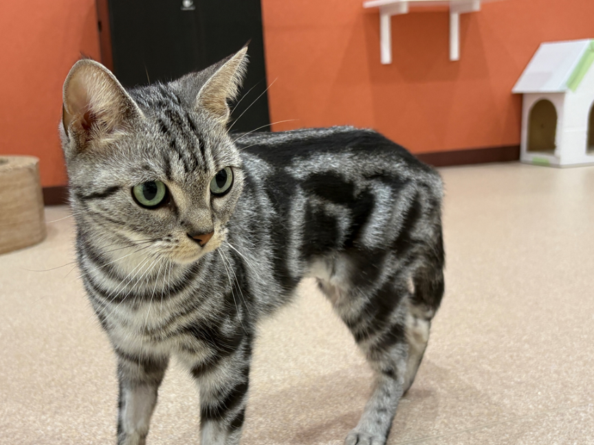 くっきりとした縞模様が特徴的な女の子、グリーンの瞳がとってもきれいです!自分のお部屋から人をみつけると「なでて~」と甘えた声ですりすりしてくれます。新しい場所では少し警戒して、まずはパトロール。でもおやつは大好きなので、新しい場所でもパクパク。新しい環境では、彼女が安心できるスペースでおやつをあげながら仲良くなってください! |