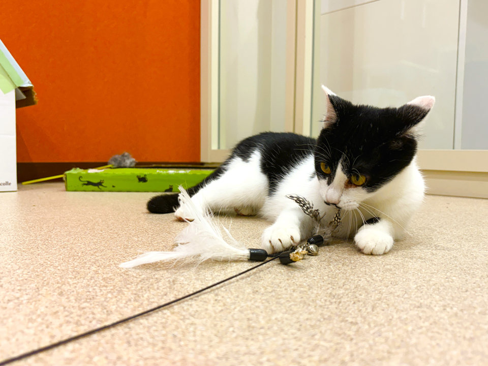 オスの子猫にも負けません!元気でやんちゃな女の子。 目に止まったターゲット(おもちゃ)は逃がさない!狙いを定めて飛びかかり捕まえます。まだまだ遊び盛りのこの子と毎日たくさん遊んであげて、長い年月成長を見守っていただける飼い主さんを募集中です。 |