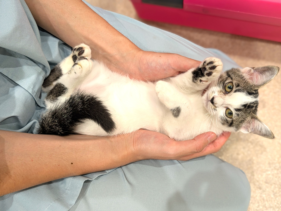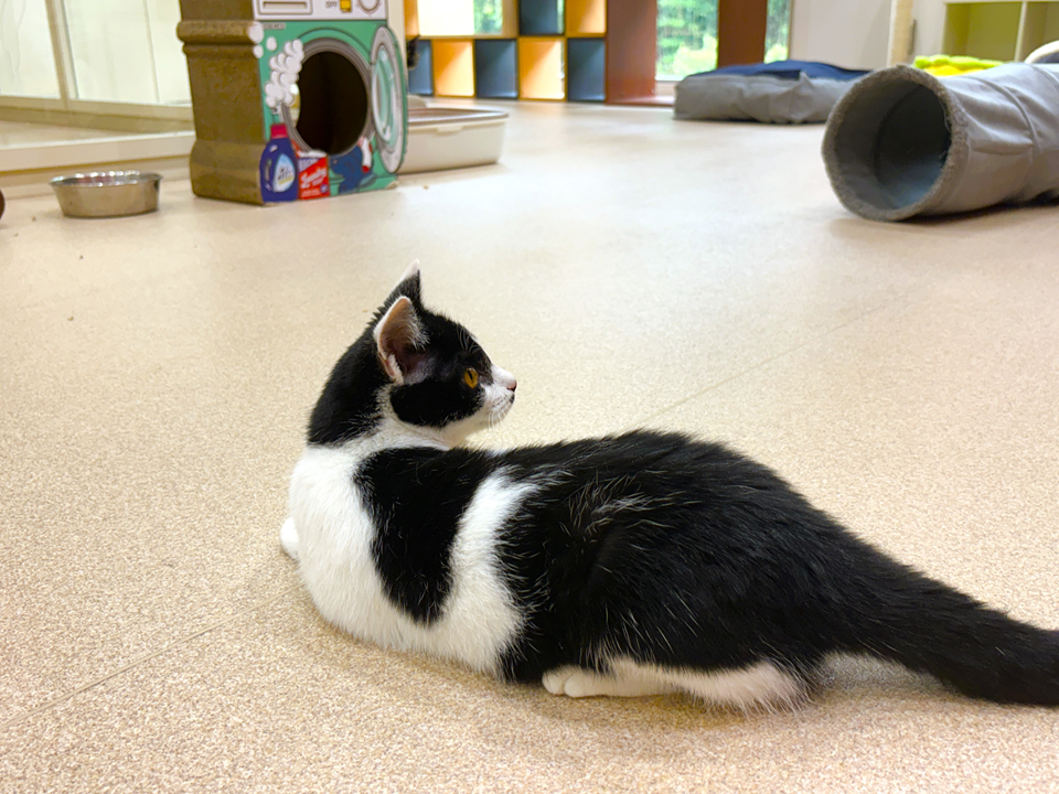 黒の模様が特徴的な元気な男の子!人が近づくと「なぁに?」と、とことこ寄ってきてくれます。抱っこしてなでなですると、気持ちよさそうにゴロゴロ。馴れてくると、前足をふみふみしてくれる様子がとてもかわいらしいです。おやつ大好き甘えん坊さんと、たくさん遊んでくださる飼い主さんを募集中です。 |