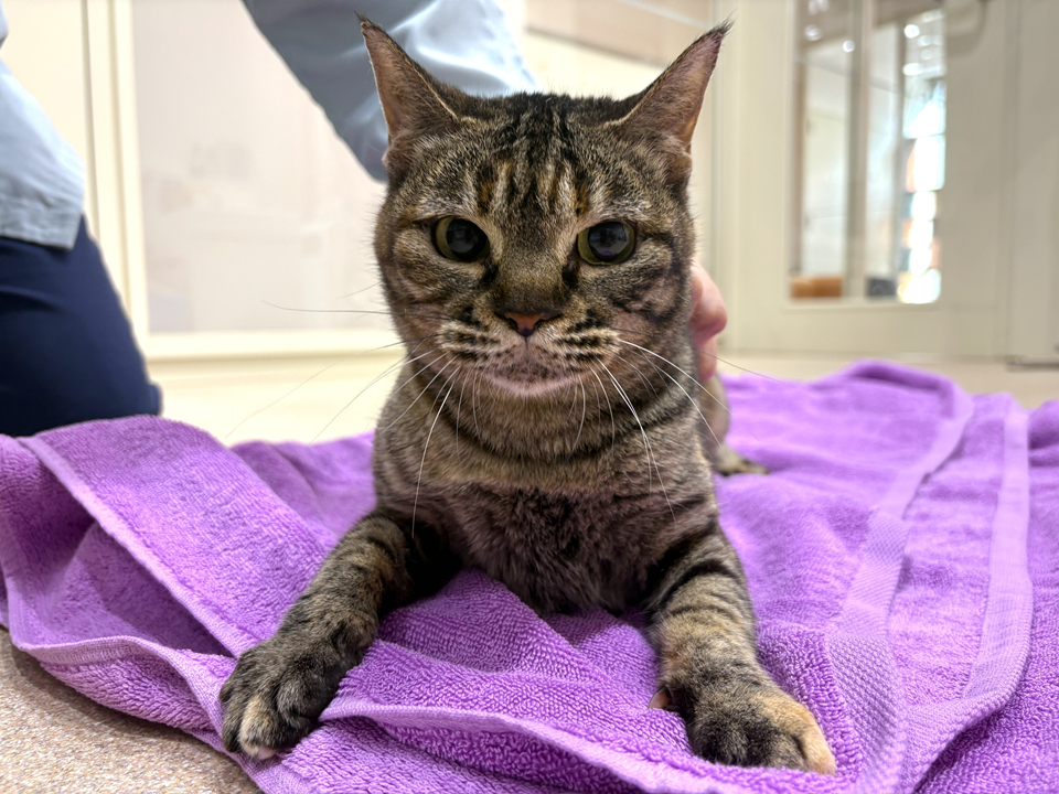センターの最古株!来た当時と比べて、表情も身体も随分と丸くなり、最近では他の猫とも仲良くずっとニコイチでいます!興味関心が強く、初めての人にも恐る恐る近づいてきてくれます。おやつが大好きで、手からもりもり食べてくれますが、勢い余って指に噛みついちゃったりすることも…。 少し強面な顔をしていますが、撫でていると、ゴロゴロスリスリと甘えん坊な一面もあります。渋い声がとっても魅力的な、困り顔のずんぐりかわいい子です。ぜひお友達になってあげてください。 |