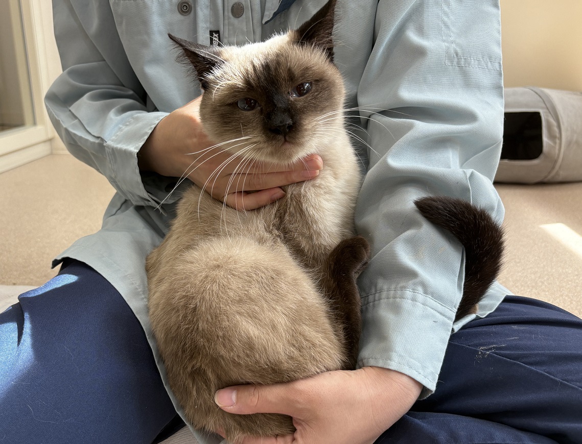 三毛猫の女の子です。少し怖がりさんですが、おやつをあげながら抱っこやふれあいなどでコミュニケーションをとって少しずつ仲良くなる練習中です!彼女の頑張りのおかげで来た時より少し慣れてきてくれています。鳴き声がかわいいこの子と、時間をしっかりかけて仲良くなってくださる飼い主さん募集中です |