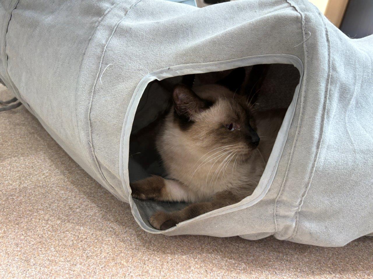 首元にグレーのスカーフを巻いたような毛が生えているのが特徴のお上品な女の子です。普段は自分の好きな場所でゆっくりとしていることが多く大人しいですが、おもちゃで遊ぶのは好きで、おもちゃに優しくアタックしています!そんな優しいこの子と仲良く暮らしていける飼い主さんを募集中です! |