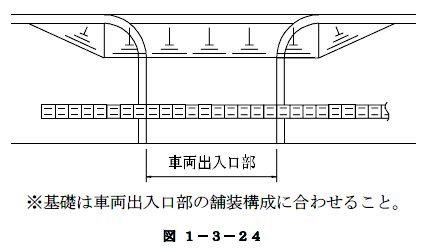 (注)広幅員の歩道の場合には、民地から歩道上への看板等のせり出しや自転車の放置など障害を考慮し、1m程度を標準とした。 - 車両出入口部の設置例