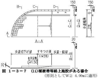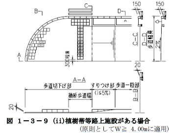 中央分離帯の切下げは、横断歩道の幅員に合わせる。中央分離帯の路面は、中央分離帯幅(W)がW≧1.5mの場合は段差を設ける。段差は 2cmを標準とする。W<1.5mの場合は段差なしとする。 - 歩道等と民地とのすりつけ