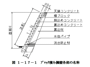 擁壁背面には裏込めコンクリートを設ける。裏込めコンクリート厚さは表1-17-4の値を参考とし、等厚とすることを原則とする。