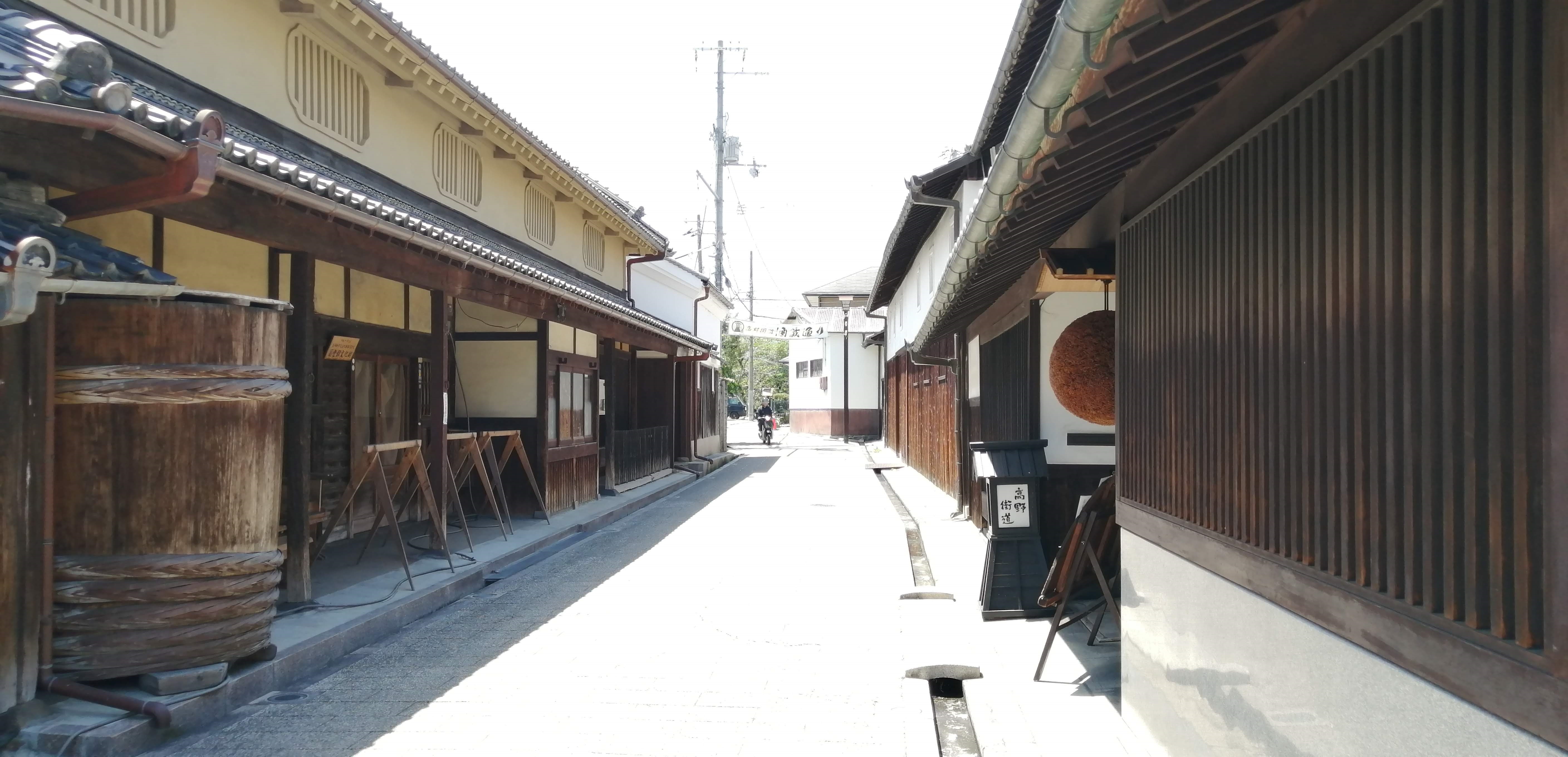 河内長野駅からすぐの高野街道を少し歩くと天野酒で有名な蔵元を中心に杉玉を軒に吊っているまちなみ。
