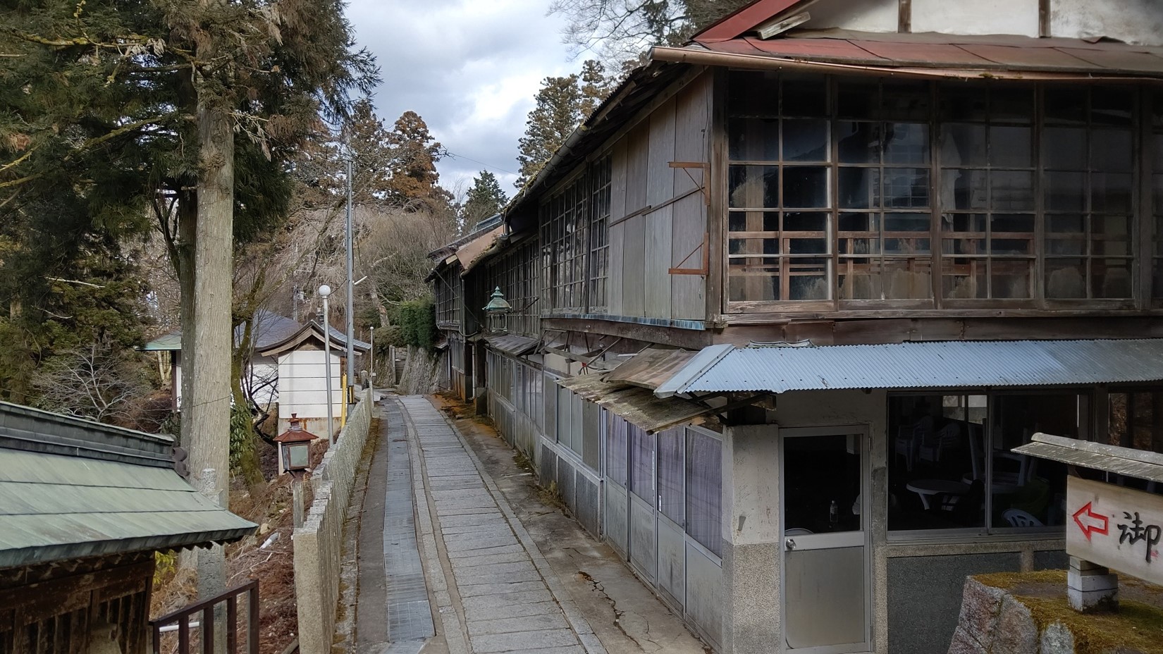 能勢妙見さんの参道にある廃業した旅館、土産物屋さんの景色を眺める能勢妙見さんの参道