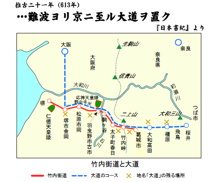 「日本書紀」の推古天皇21年(613年)の11月の条に「難波(なにわ)より京(飛鳥)に至る大道(おおじ)を置く」と記述があることから、日本最古の国道(官道)と呼ばれています。
