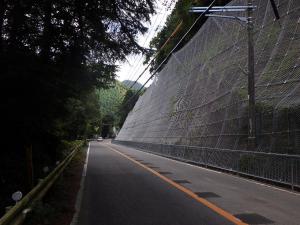 - 説明 定期点検の結果、道路法面から落石や土砂崩壊の可能性があり、危険度が高いため、落石防護網を設置する対策工事を行いました。